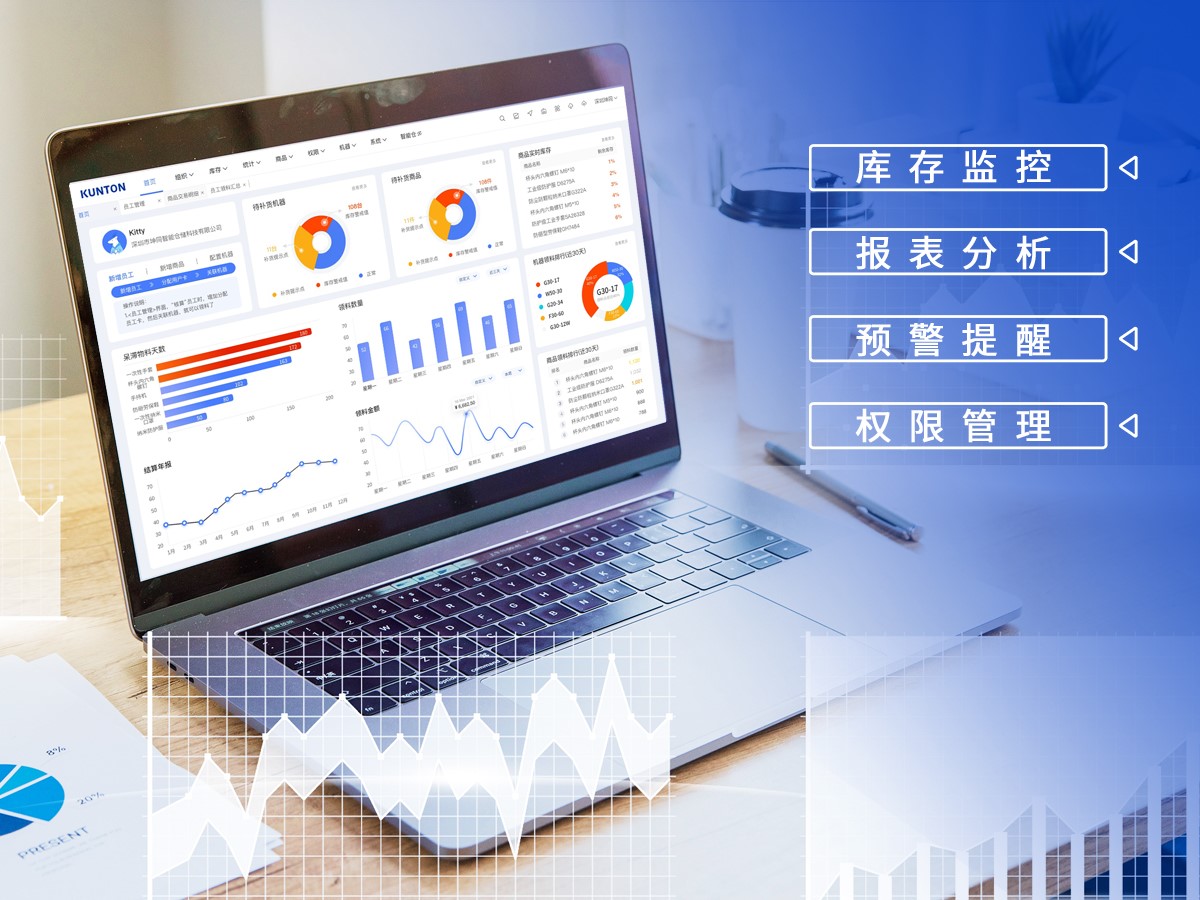 KUNTON智慧管理平台强大的统计分析能力实现管理数字化,支持对接常见的SAP、ERP、OA等系统;一键导出自定义分析报表可依据物料库存、领用数据、领用人员等维度,告别手工对账,避免错记漏记问题。